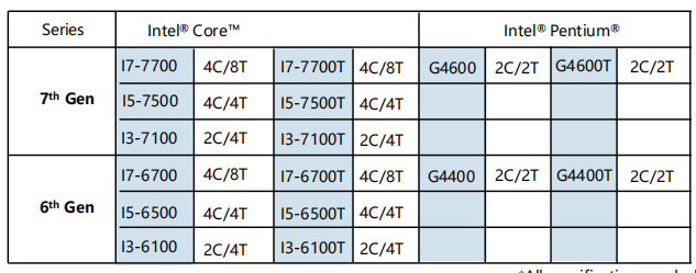 CPU | Processadores Intel® Skylake-S de 6ª geração/Intel® Kabylake-S Pentium/Core i3/i5/i7 de 7ª geração, soquete LGA 1151 |